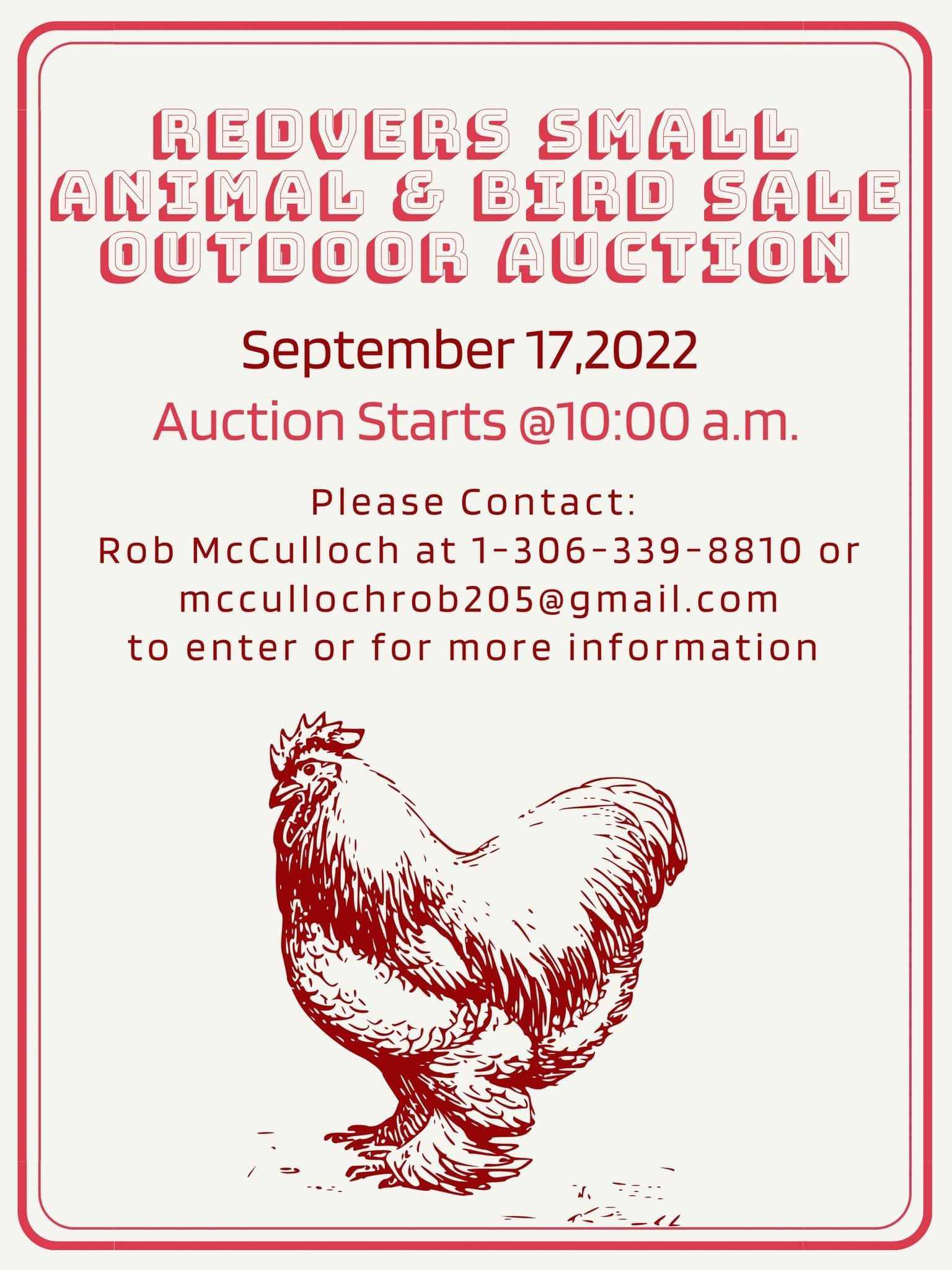 Rec Centre Methuen St Redvers, SK Auction starts at 10am 15% commission on all sales plus a membership of $10 Hosted by the Redvers Small Animal & Bird Organization For more information and to enter, contact: Rob McCulloch (306) 339-8810 mccullochrob205@gmail.com For current date and for other Canadian shows, |