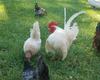 Small Seramas, bantams. Some black, some blue and white spotted and some red and gold. Head is directly over their feet. Wing feathers drag the ground …
