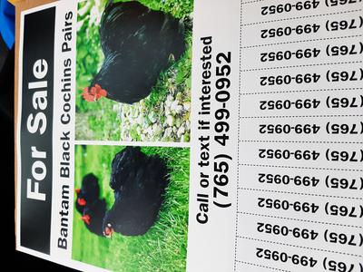 Beaded Black Silkies pairs &Black Bantam Cochin pairsText or email if interested 765-499-0952 Jennyzeeb794@gmail.com.