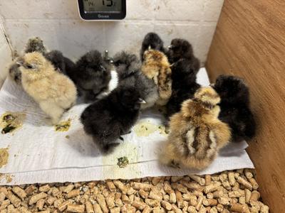 Show-quality gorgeous silkie chicks, some from exhibition lines. Straight run. Buffs, white, black, cuckoo, splash, chocolate, paint, some frizzles, etc., hatching weekly from February through September unless by preorder.